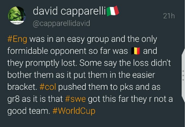 Here’s the thing my initial reply was going to be a lot different. Originally it was ‘wow. Brilliant comeback. I hope you didn’t hurt yourself coming up with that one. ‘ but I decided to take the high road (notice the hashtag). Look, even if England wins it and in all likelihood they will be in the final, it changes nothing about what I wrote. To this point it is accurate and the truth. Unfortunately…