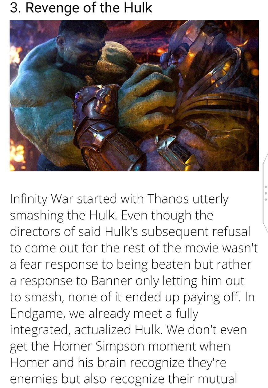 That scene where he grudgingly smashed the top of the car and barely tossed the motorcycle. WOW!!! Horrible. So Hulk now is a lover, not a fighter? Ridiculous! And finally to witness an epic battle scene versus Thanos where a significant amount of heroes took a shot at him and there is NO HULK AND THANOS SHOWDOWN!!!! What in the fucks, fuck is that all about? How does that not happen??? Pure and unadulterated fuckery is what it is.